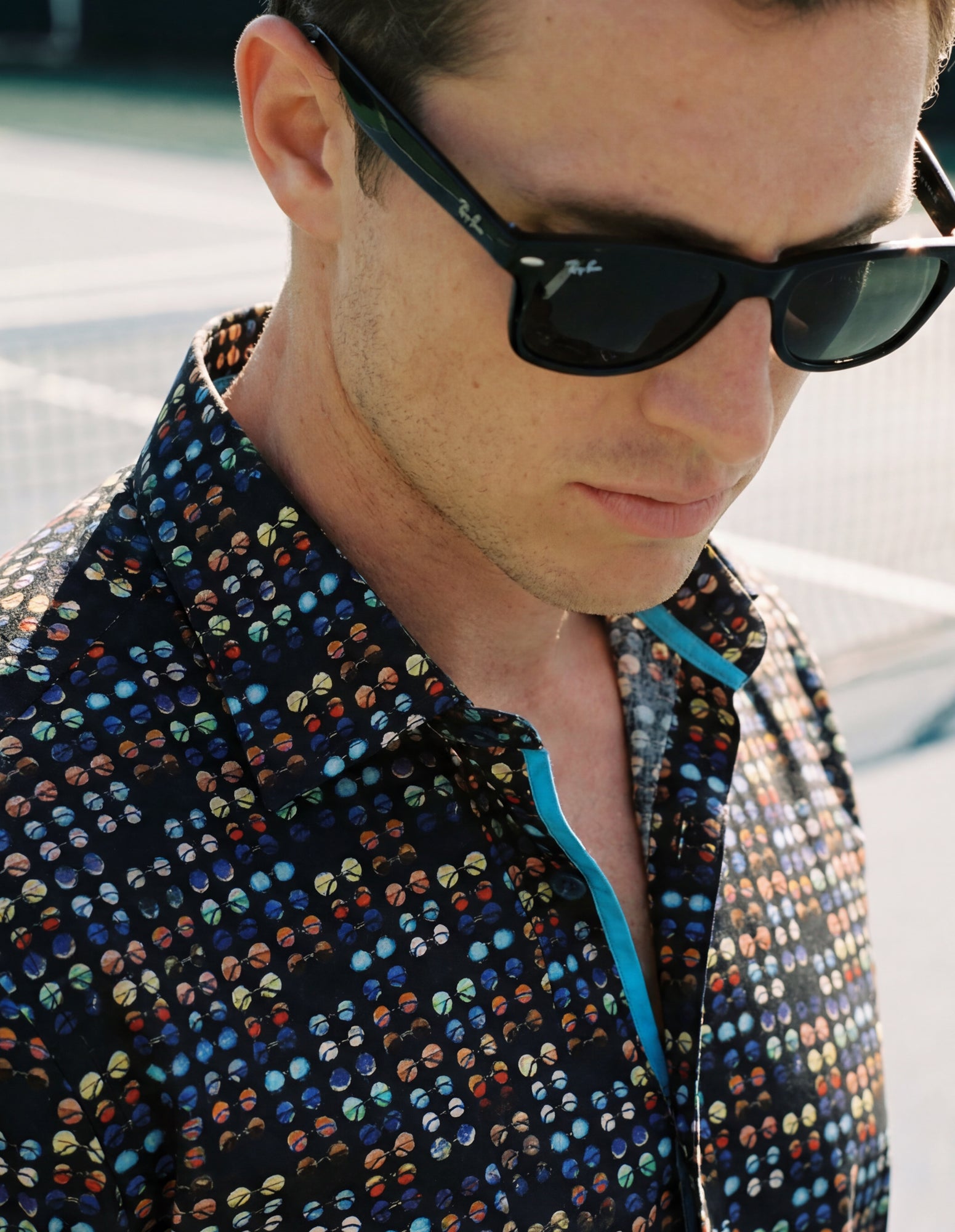 This exclusive shirt from brand Jimmy Fox marries understated luxury with distinctive design. The 97% cotton sateen foundation delivers a soft, fluid drape with gentle lustre, while the 3% Lycra provides elasticity and shape retention through repeated wear. A signature sunglasses print strikes a balance between graphic presence and refined restraint.